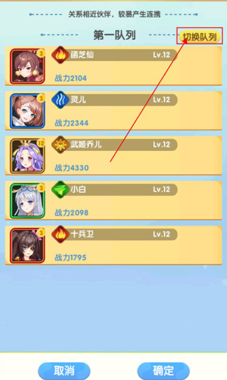 3、进入阵容页面之后可以看到每个英雄的战力,可以点击右上角的切换队列,就可以开始切换阵容啦!