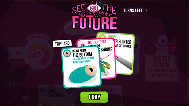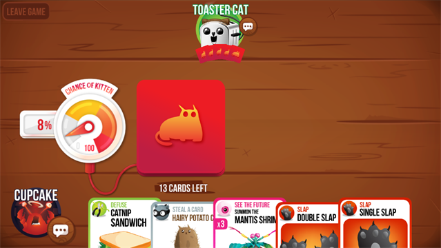 3、在这个多人猫咪卡牌游戏中,玩家抽卡直到抽到一张爆炸猫卡牌,自己飞到空中,然后就出局了,除非有一张解除猫咪武装的卡牌。