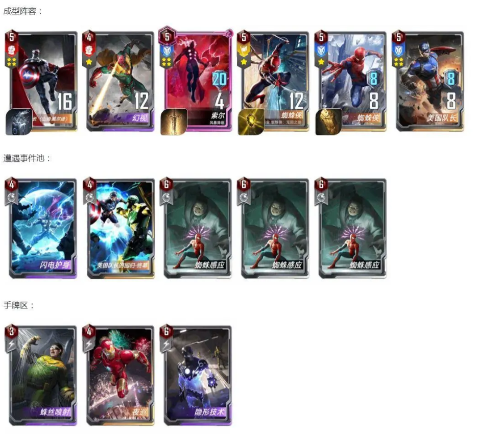 共生体蜘蛛侠(4张):作为卡组的后期核心角色,共生体蜘蛛侠的暴击词条对于卡组的输出至关重要。