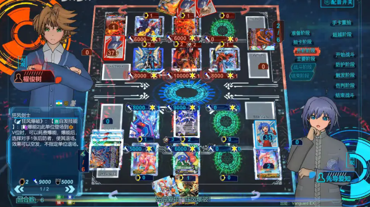 对手的回合开始,从卡组中抽取一张卡进行提升。他互换了两张单位卡,进入对手的攻击步骤。对手使用先导者对我的先导者进行攻击。此时,我可以从手中将单位卡横置进入防御者元正中进行防御。这样,我被攻击的单位力量将上升,防御者元正中卡片的护盾直至13000点。防御完毕后,进行攻击方先导者的驱动判定,检查是否判定出触发单位。不同的触发单位会带来不同的触发效果,其中还有威力十分强劲的超限触发。