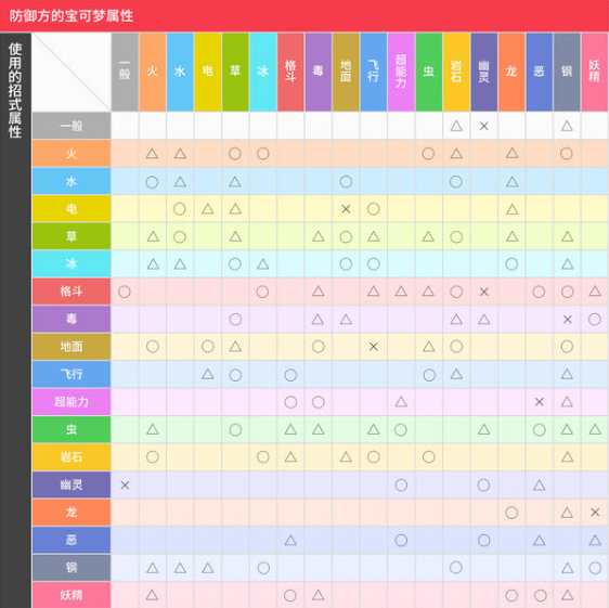 可以参考以上表,或者自行百度搜索宝可梦属性相克,圆形代表克制,三角形代表微弱,交叉代表无效。当攻击方触发克制时会提高20%伤害,触发微弱或无效时会减少20%伤害。攻击方无论是普通攻击还是招式都会触发属性相克,如果攻击方的属性可以克制防御方两个属性,则会触发双重克制,例如冰系克制龙系和飞行系的情况下,如果防御方为龙+飞的属性,则冰系伤害会提高40%