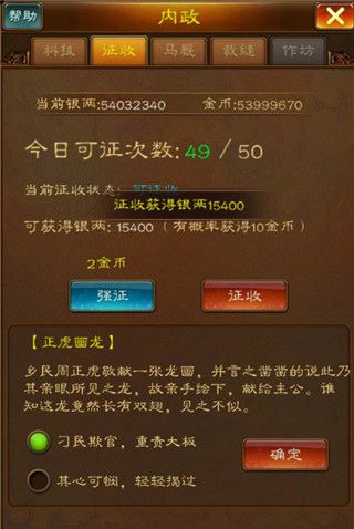 每日可进行一定次数的征收操作,进行征收操作后获取一定量的银币,每次征收有一定几率获得10金币的奖励。