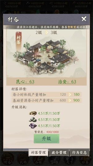 4、点击地图中间的建筑可以对村落进行升级,升级后会获得更多的资源。
