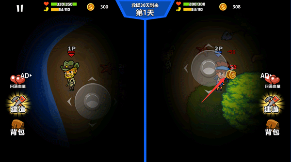 1、游戏支持两个玩家同时游玩,在海岛上收集资源,建造武器,抵抗怪兽。