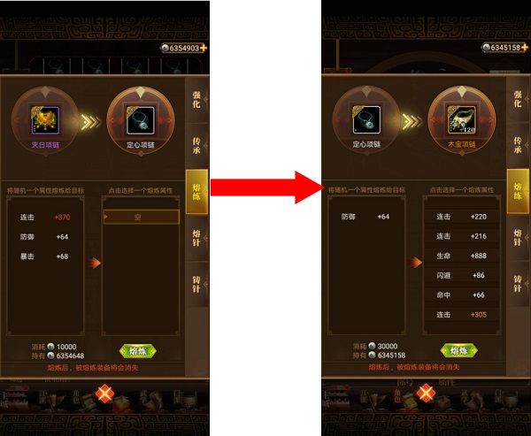 装备一定要注意一个坑,那就是强化后的装备等级是可以传承给新装备的,不要将强化后的装备直接作为经验,这样只相当于一件装备的经验。而装备下面的附加属性是可以通过熔炼来进行替换的,这里告诉大家一个小技巧。如果自己的装备是A,拥有极品属性的是B,那么不要直接将用B和A进行熔炼,而是应该先拿一件白色装备C,如果C运气好随到了B的极品属性,然后再将C熔炼给A,这样A就能够必定拿到极品属性了。前中期最好的装备就是四阶玄铁装备了,玄铁装备2、4、7件还能分别激活三个被动称号,加属性,中小R甚至可以用玄铁用到死,而玄铁主要是通过经书来兑换的,所以经书非常非常重要,大家一定不要前期把经书随便花了,以免可以换玄铁了追悔莫及。