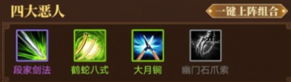 前期十连抽奖的主要目的是为了拿五毒、四大神僧、四大恶人(具体可以去武功组合那里看效果)这三个前期最重要的武功组合,其中五毒推图神器,四大神僧前期PK非常厉害,四大恶人推图和PK兼有。