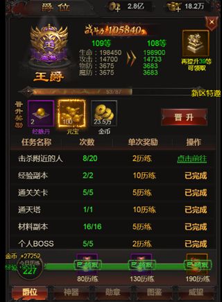 爵位可通过晋升以及提升官位来拥有奖励和增益。爵位晋升需要获取“历练值”,可通过完成每日任务获得,请积极完成日常吧,当历练点积攒到一定程度就可获得晋升机会,晋升可提升多种属性的同时,还可以获得元宝,金币和经脉丹等材料奖励。