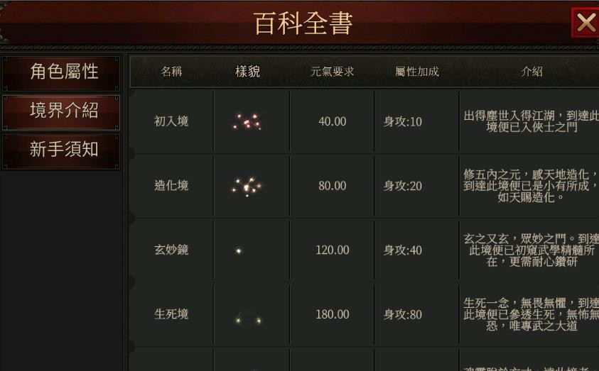 5、把武功修炼到满级后,会增加一定的元气,元气越高,境界也就越高,还会给身功的属性加成和外观显示。