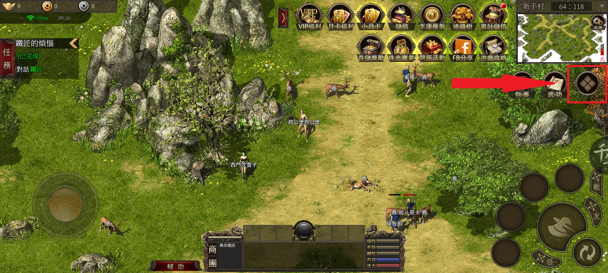 4、我们初期可以打一些鹿、狗、猪掉落一些肉和骨头,进行出售来获取银币,再找NPC购买武功进行修炼,银币除了购买每种武功外,很多装备的提升也需要银币。