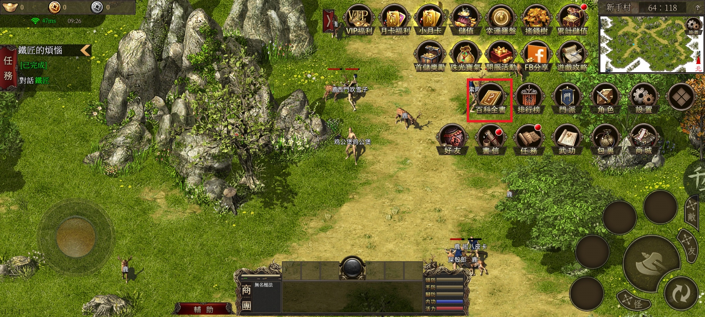 3、百科全书裡记录了怪物的分佈地区,以及掉落的物品,还有一些武功介绍、装备介绍、活动介绍。