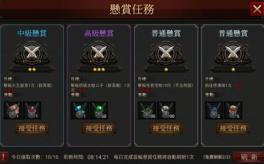 9、我们每天都可以接取10次悬赏任务,悬赏任务分为五级,普通悬赏、中级悬赏、高级悬赏、至尊悬赏、神级悬赏、每个悬赏任务都有对应的奖励。