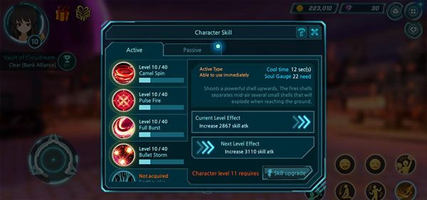 每个职业都有独特的五个主动技能,随玩家等级的提高依次解锁,使用金币可升级技能从而增加伤害。除主动技能外,玩家也可以选择升级普攻、生命值、闪避等特殊技能,能够增加对应的属性。
