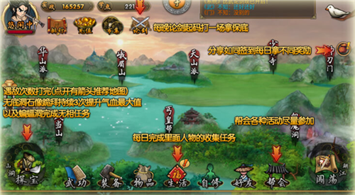 如图所示有每日建议必做的环节,另外提醒的是进入各大地图场景中都会定时开启江湖副本。同理门派试炼有一定几率掉落江湖秘极和属性丹等稀有道具。