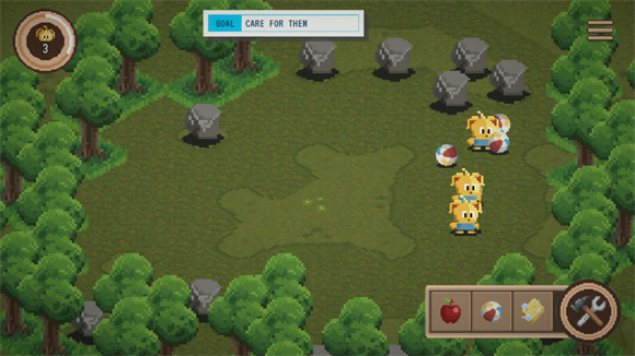 2、正式开始后点击右下角的按钮来放置不同的道具培养小人。