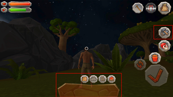 如果想要在地面上建造属于自己的房屋,可以点击右上方红色框框选择的图标,只要看到人物的小圆圈定位在哪儿,你就可以选择你要放置的东西开始创造。