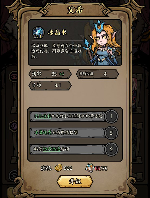 召唤冰晶发动攻击,以穿透和冰冻为主,升级后可以提升冰晶数量和冰冻属性。
