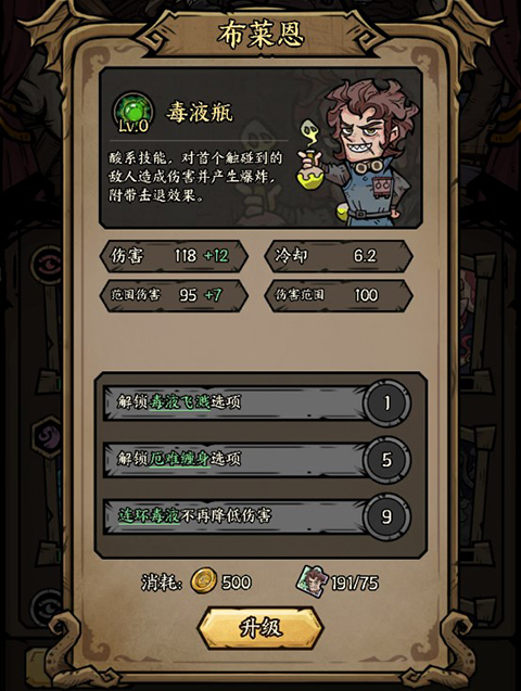 武器为毒液瓶,丢出毒液瓶可以产生爆炸和击退,升级后可以提升数量和范围。