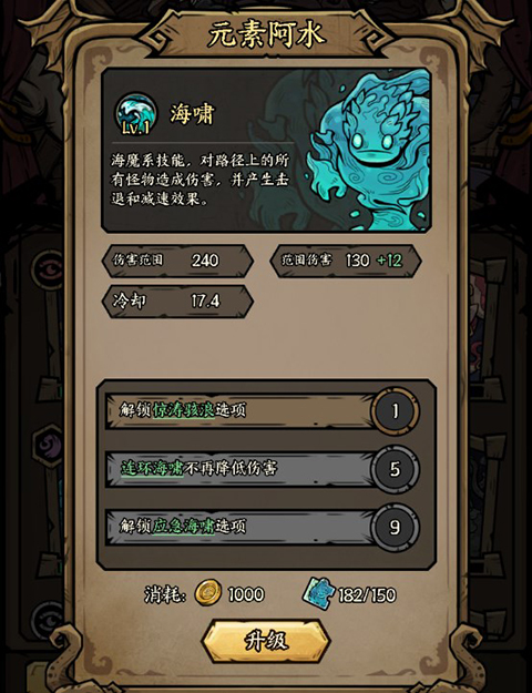 水元素精灵,可以召唤海啸,击退敌人并造成伤害,升级后可以造成额外伤害以及提升速度。