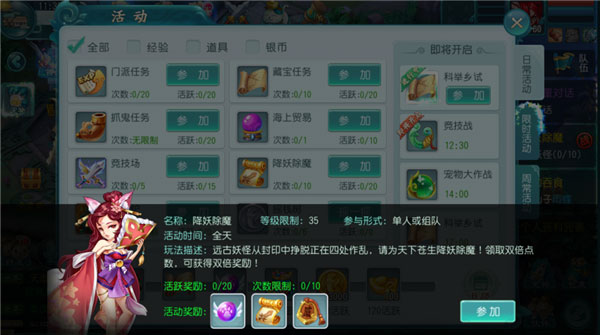 参与方式:点击“日程→降妖除魔”前往或飞到指定场景击杀远古妖魔