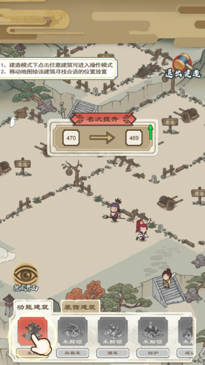 1、想要建立门派的你开局自然是要先建造一座大殿,但光有大殿太冷清了,先去招募一些英才来加入门派。