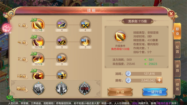 技能状和被就要技能书来升级,已知的技能书获取途径,除了日常任务,挑战积分兑换外,当属每周20的恶魔令任务产出的概率最高,把本职业的技能书留下,其它职业的可以摆摊卖掉换成金币,急需时可直接在摆摊中购买本职业技能书用于升级技能,提升战力。