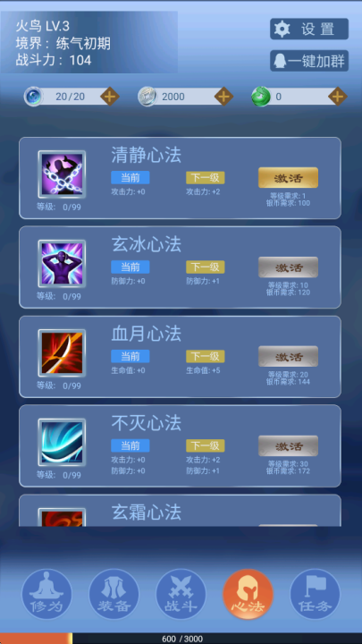 银币获取途径只有看广告,主要升级天赋和和锻造装备都是大头,记得有灵石要留着首先购买单方,不然无法炼丹。