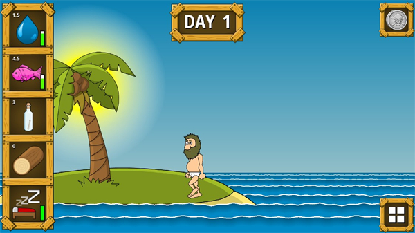 2、游戏的玩法很简单,主要的目的就是让求生者活下来,然后想办法逃离小岛,求生者每天都需要做不同的事情,当水没有的时候要出去找水,没有吃的的时候要出去捕鱼,还有正常的睡觉时间,做被日梦可以增强生命力,还需要不断寻找木头制作木筏,每天都可以找到漂流瓶,用漂流瓶发出求救信号。