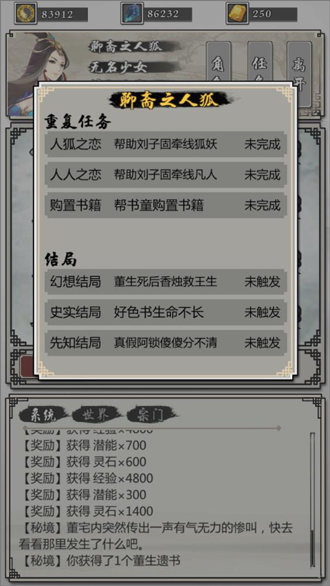 2、史实结局:对话董遐思,被赶出来后,进去搜取董生遗书,然后到王宅对话王九思,然后重新进去杀掉狐妖。