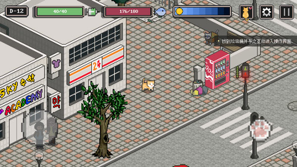 你的生命状态会以健康值和饥饿度来显示,你可以在小镇中获得食物来生存,在经历了13天之后,你会长成一只大猫。