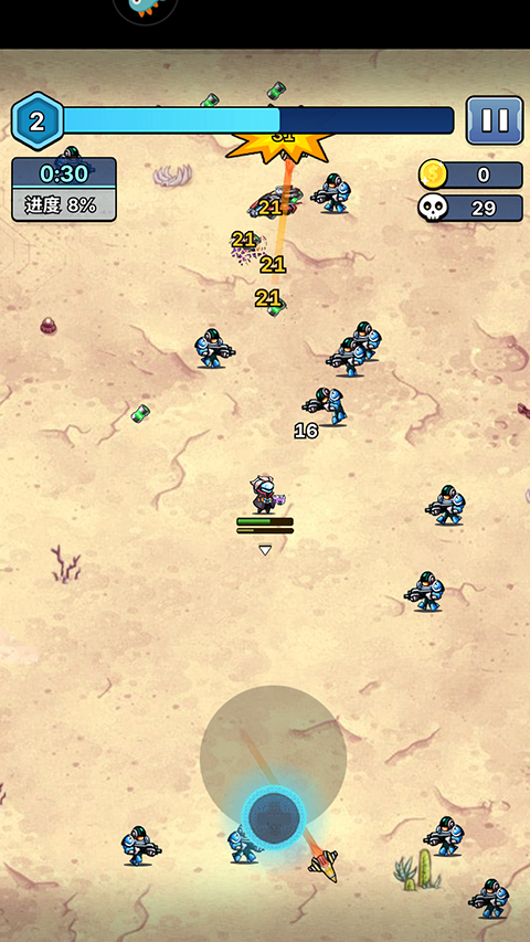 1、进入游戏后通过触摸屏幕来进行移动,人物会自动攻击。