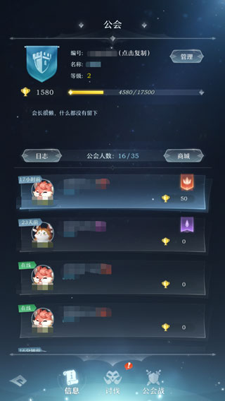 最后就是工会啦!这么明显的名称,小编都觉得可以不用介绍了,不过作为玩法之一,还是要说明一下。工会有boss讨伐玩法,主要是看冒险者的小队把boss打出多少输出来决定奖励的丰厚程度,这里可以获取钻石、装备、公会币等。还有一个功能就是工会战,顾名思义就是与其他工会进行战斗,具体的战略就由会长或者长老来决定啦,是pvp中的一环。