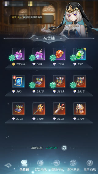 杂货铺:售卖培养资源和装备的地方,不过在前期的话不太建议买装备,因为杂货铺里的装备是会随着通关的关数提升,在后期如果有需要时可以进行购买。第一排的培养资源是比较建议购买的。