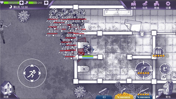 游戏采用俯视视角,副本无迷雾,一切地形与怪物尽收眼底,是迎难而上,还是避其锋芒都由您来决定;双轮盘操作,可一边移动一边射击,武器蓄力时,亦能利用走位躲掉怪物和丧尸的攻击。