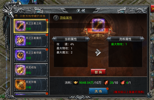 通过洗练可以提升角色的属性和技能,使角色更加强大,在游戏中玩家可以通过洗练改善自身装备的属性,提高战斗力。在功能栏中可以找到洗练,点击洗练,即可进入装备界面进行装备洗练。洗练装备只能给自身的装备进行洗练,脱下的装备与放在仓库的装备是无法参与洗脸的普通洗练的材料为洗练石,配饰则出了洗练石,还需要,星王结晶。而且装备必须魔龙级以上方可洗练。装备的稀有程度不同,洗练的上限也不同。