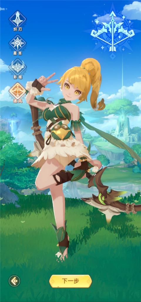 逐风身着轻盈的绿金色战甲,羽叶点缀衣摆,象征着她与风息共鸣的天赋。