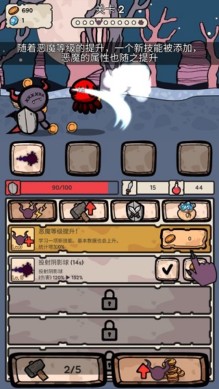 1、所选的恶魔通过不断的击败各种怪物们,就能让自己属性不断的提升,开启更多的技能。