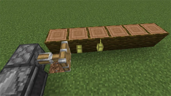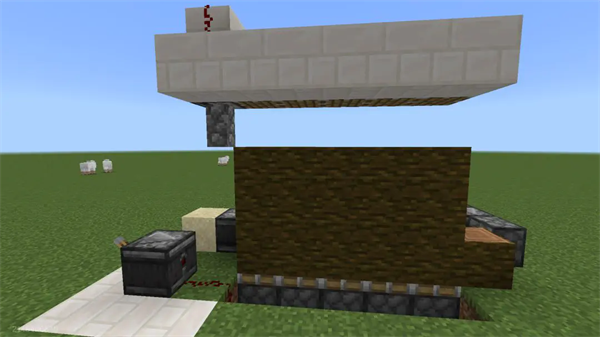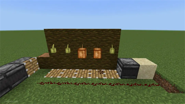随后,在丛林木最高点上方两格处放置一排向下的活塞,在放置一个检测器,检测器向下检测,随后在检测位置放置一个石墙(任何材质都可以),石墙可以保证在丛林木被推上来的时候刷新方块状态,从而使上方活塞再次推回丛林木,我们只需要再次开始种植可可果就可以了