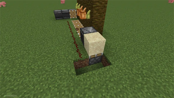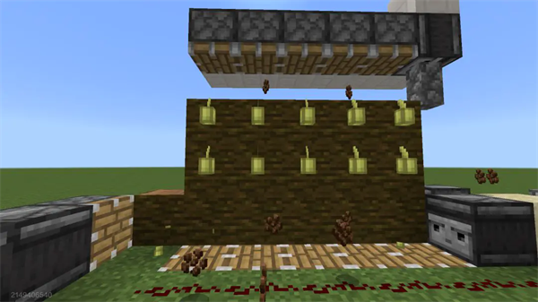 有了基本的种植结构之后,我们需要考虑如何收割可可果了,在基岩版中,可可果不会被水流破坏,所以我们需要通过活塞来晃动整个种植装置,从而使我们的可可果脱落