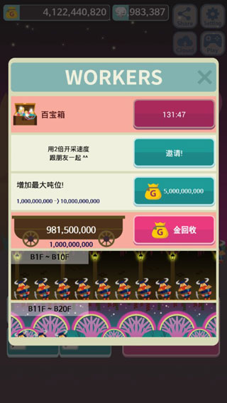 矿洞开采主要分为两个方面,其中每闯过一关都会增强一个矿工,为你带来一定数量的采集速率,利用钻石可提升开采的效率,且使用收获的金币可增加金矿的容量,一会即可让你坐拥大量的金币。