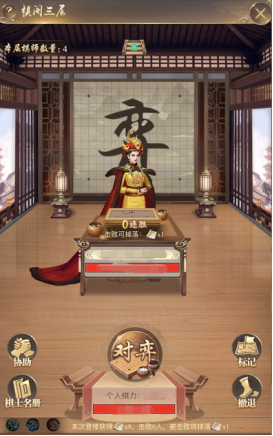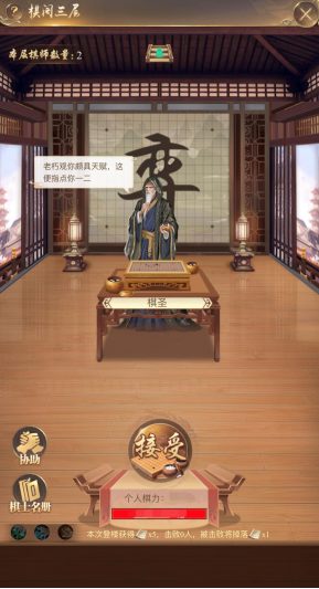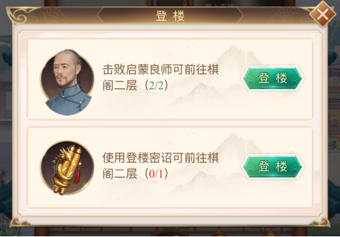 2、棋阁一共三层,圣上每天初始在棋阁一层,击败每层的高级棋士一定次数时,可以前往更高楼层,也可消耗登楼密诏直接登楼;