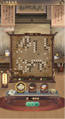 修复棋局1、对弈过程中,圣上获得的残卷、黑子、白子可用于修复棋局,修复的同时可以获得心境值;2、队伍成员可以对棋局进行修复,所有成员共享修复进度;3、不同棋局分别需要的残卷、黑子、白子总数量不同;4、黑白子当前可修复数量取决于残卷当前已修复数量,残卷提供的越多,黑白子可修复数量越多;5、必须修复完当前的棋局才可进行下一个棋局修复;