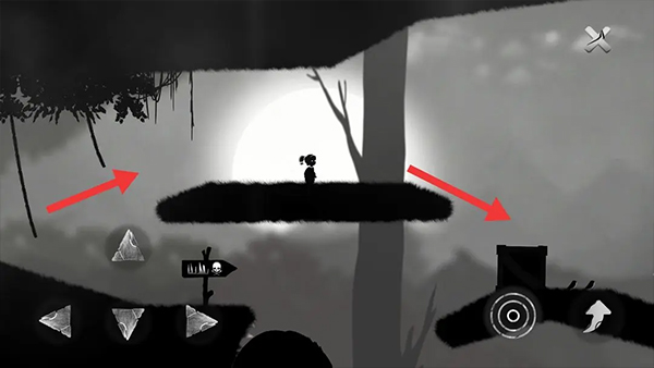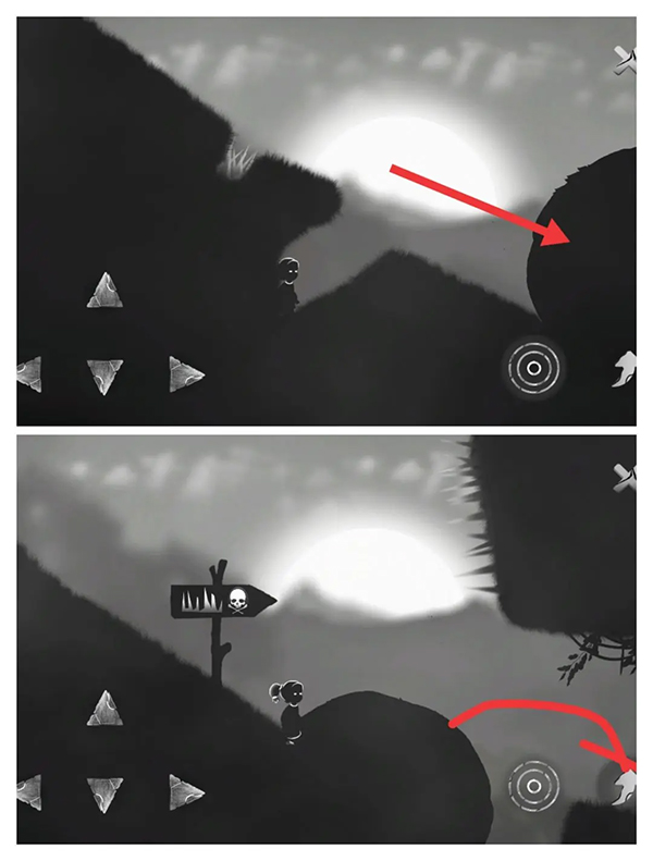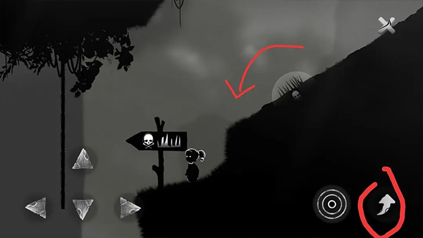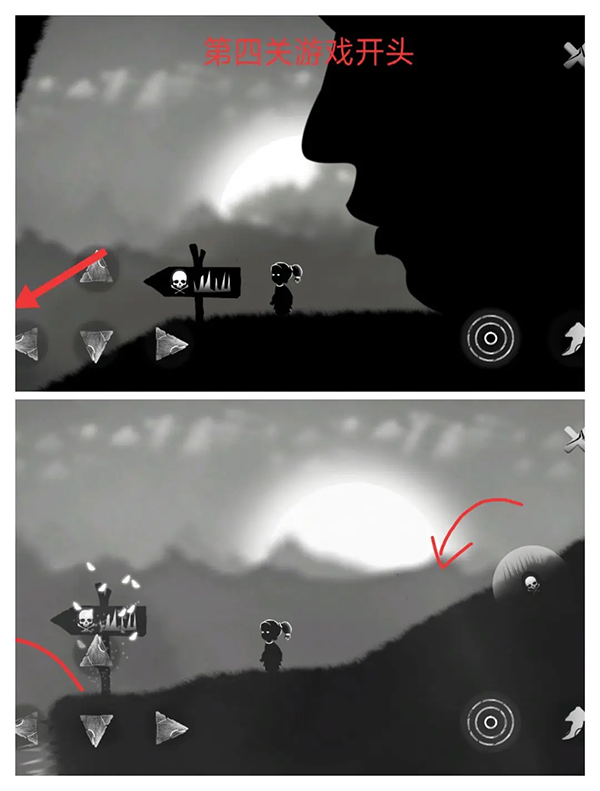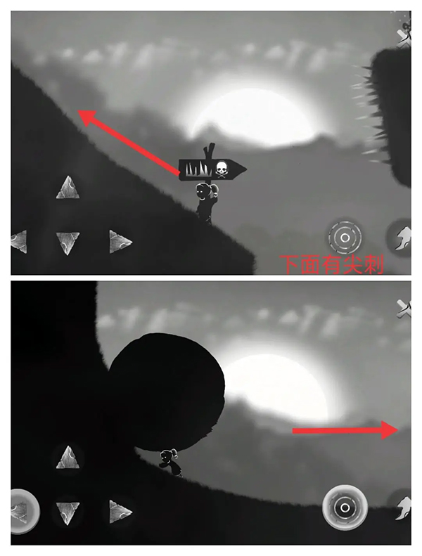 ④右走至悬崖边会出现死神。向左跑,躲避尖刺的同时注意不要被死神抓住
