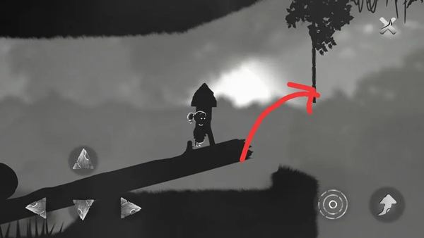 ⑨将刚才落地的小球向右推至木头上。使女孩站在倾斜的木条上跳跃抓住右上方的藤条