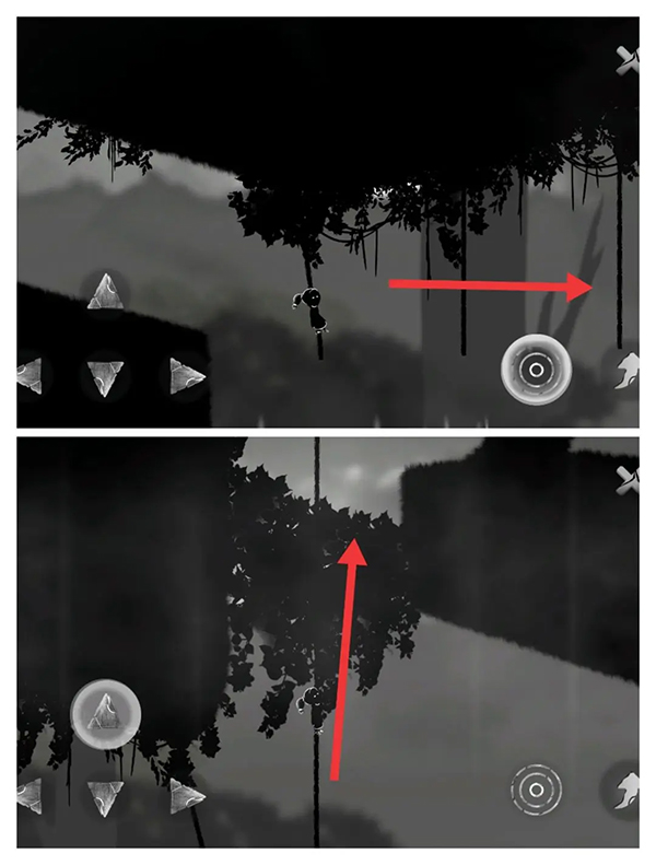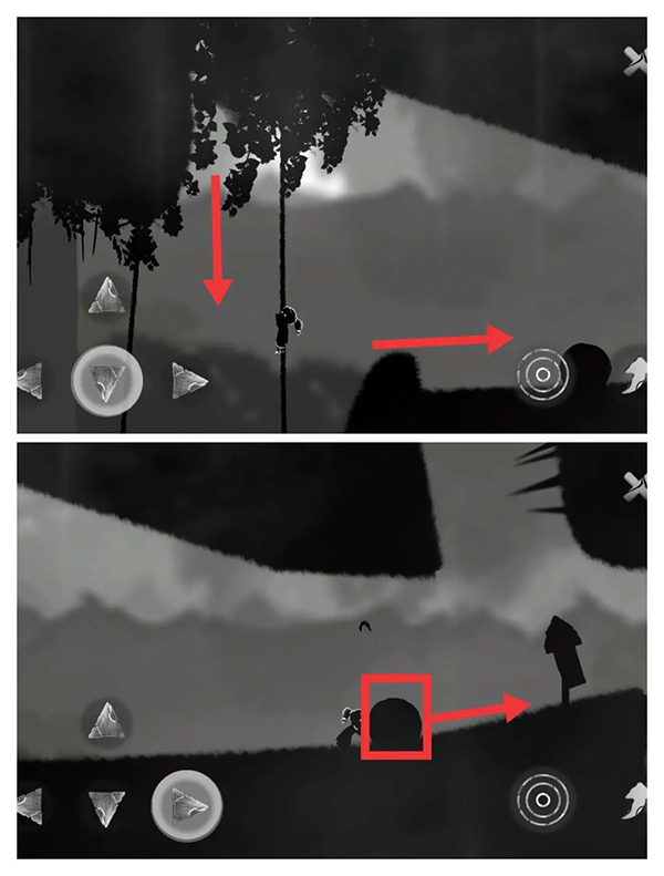 ⑤来到藤条边开启人类返祖现象,学习像猿猴一样荡藤条。注意操纵方向键,使女孩重心倾斜以便离右边的藤条更近