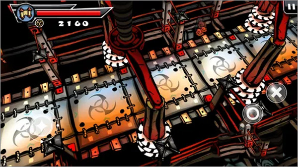 8、在前进的道路上会有旋转的切割机,这个其实以前的关卡也曾经有过的。通过切割器的旋转间隙我们翻滚到中间的位置,之后也是用这样的方法不断的前进。