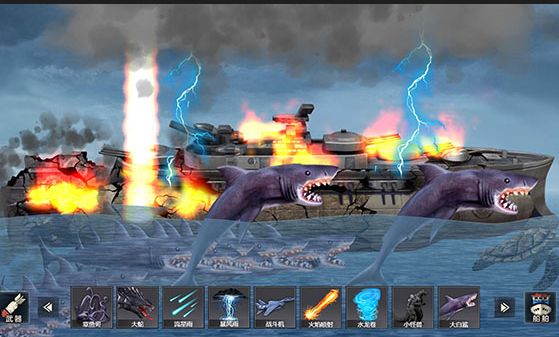 2、丰富的武器、怪物种类可供选择,拥有海怪、海神、水龙卷、洲际导弹等一系列超级武器;