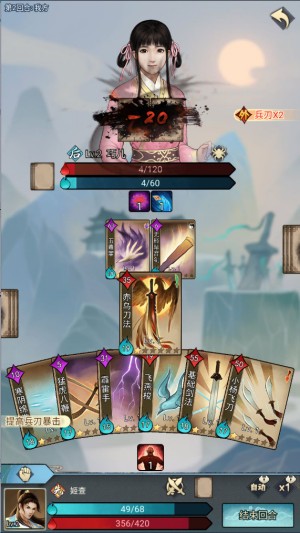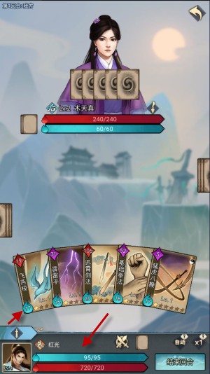 5、当无牌可打或者内力不足以打出卡牌的时候就会自动结束回合,当然也可以自己主动结束回合。