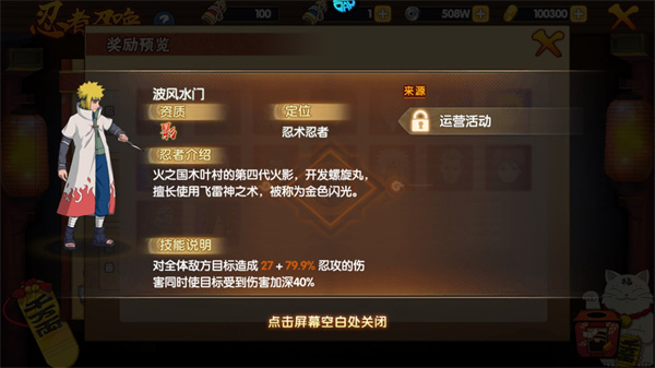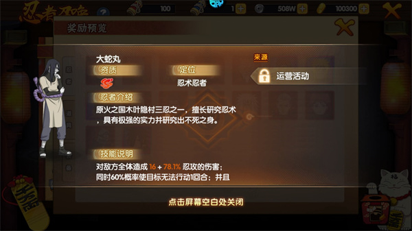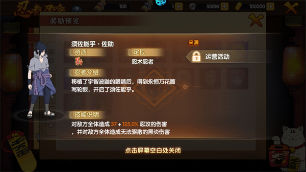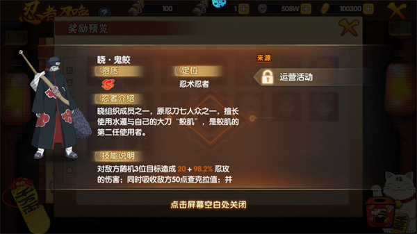 对敌方随机3位目标造成20+98.2%忍攻的伤害;同时吸收敌方50点查克拉值;并减低目标40点怒气值。