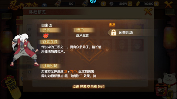 对敌方全体造成21+78.1%忍攻的伤害;同时为目标添加层“蛤蟆油”效果,持续3回合,最高可叠加5层,蛤蟆油:每层火遁技能及效果伤害提升10%。