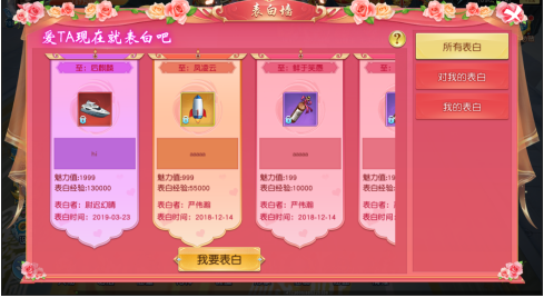 修仙路漫漫,《诸世王者》则引入了情缘系统,玩家可以通过展示对心仪之人的表白信息,提升对方好感,促使双方结为姻缘。使用不同的表白道具,可以提升表白双方的魅力值表白经验、表白积分,表白经验可用于提升表白等级,增加大量战力。表白等级的详细信息在情缘-表里面查看。